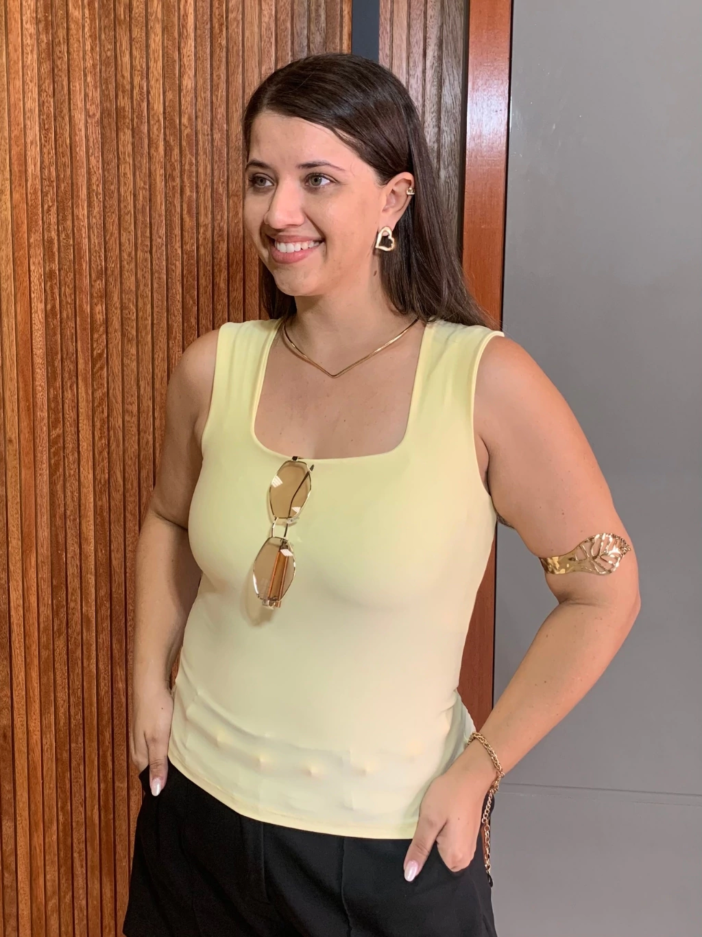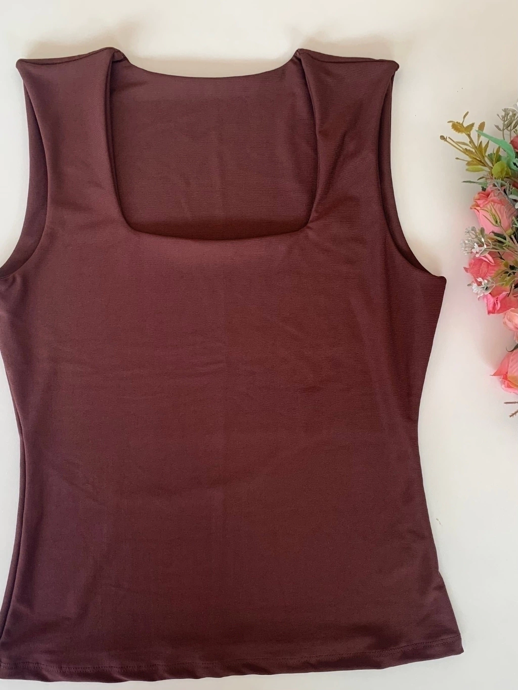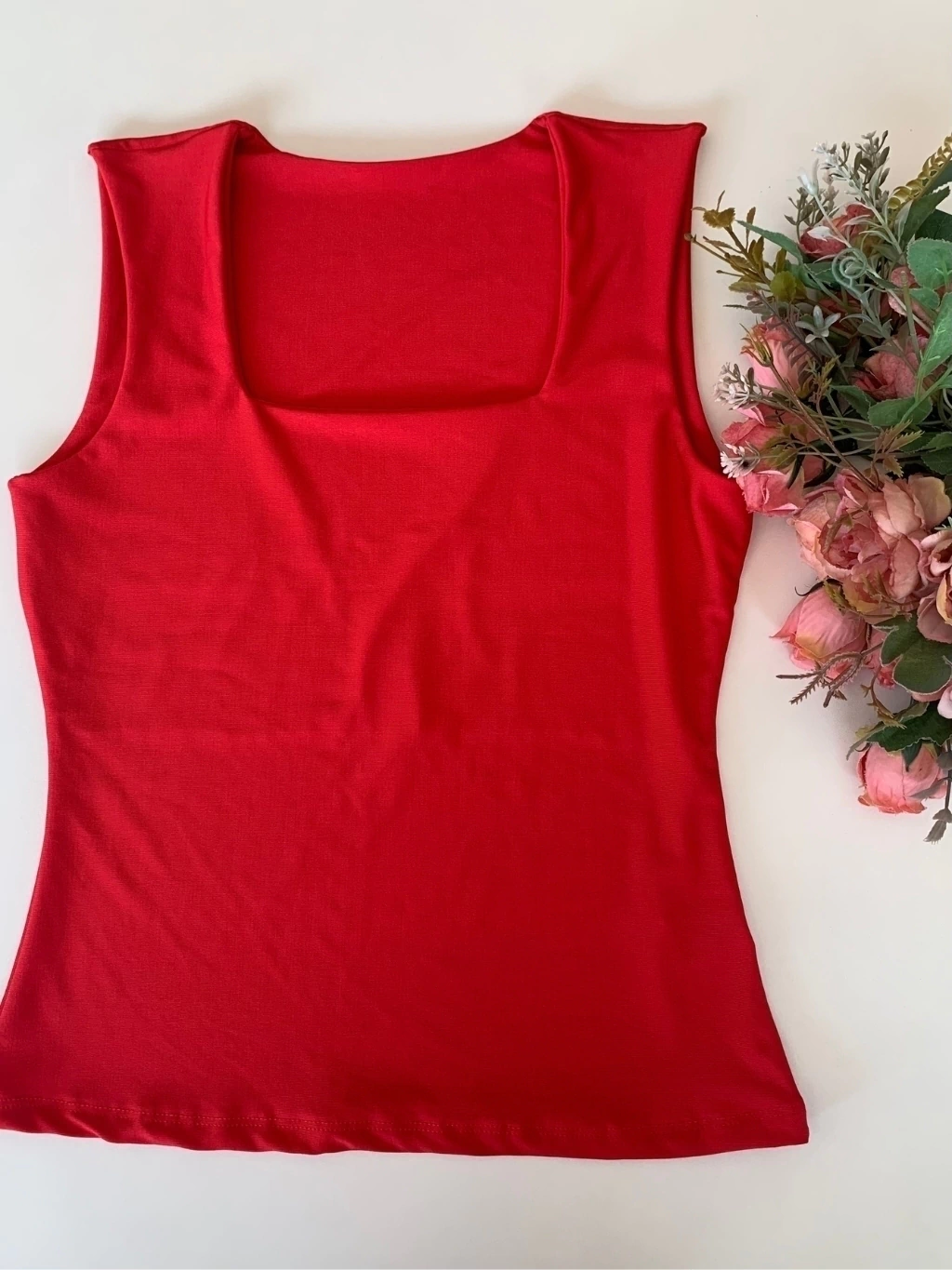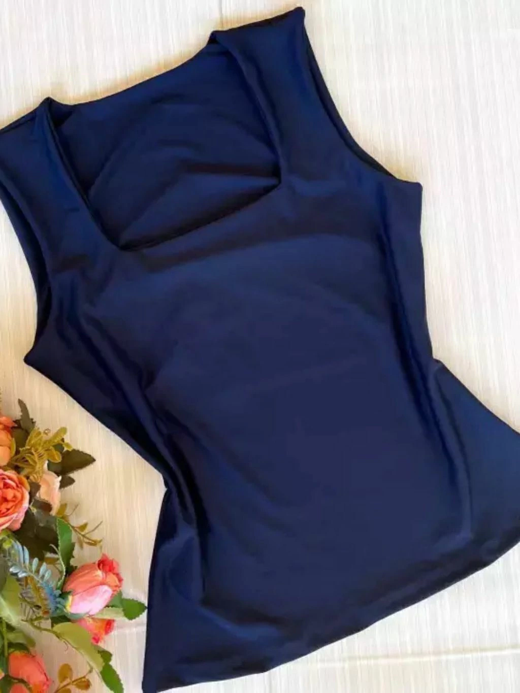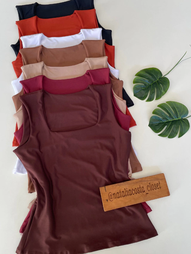 Seu decote quadrado valoriza o colo, enquanto o forro no busto garante segurança e ótimo acabamento.