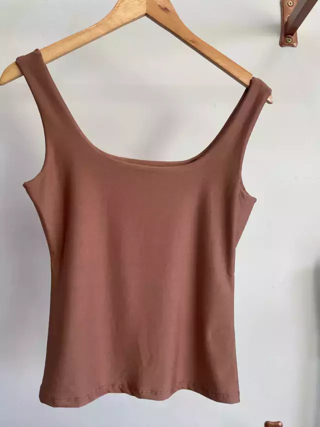 O modelo apresenta comprimento de regata e um decote quadrado, ideal para valorizar o colo de forma moderna e sofisticada.