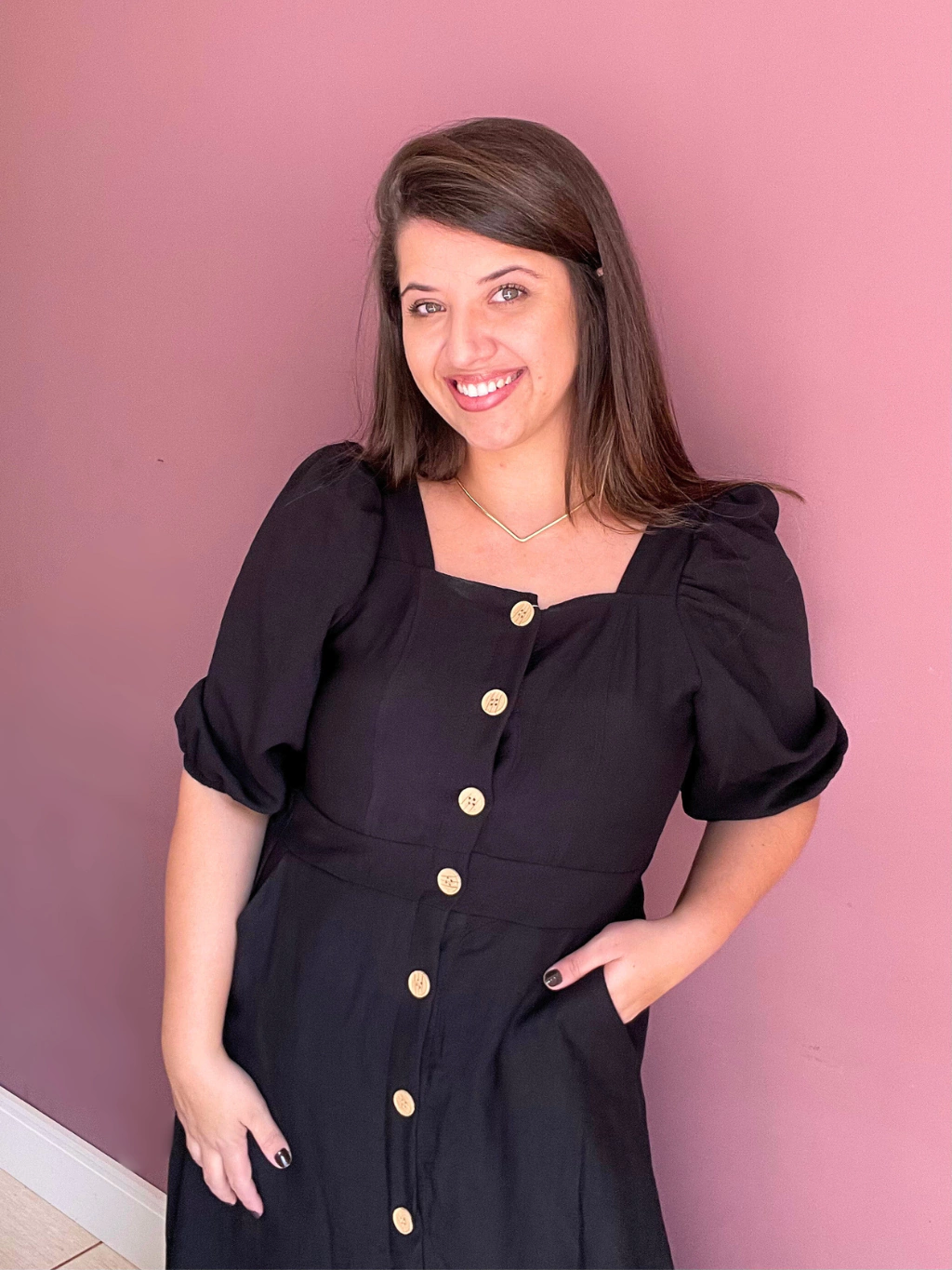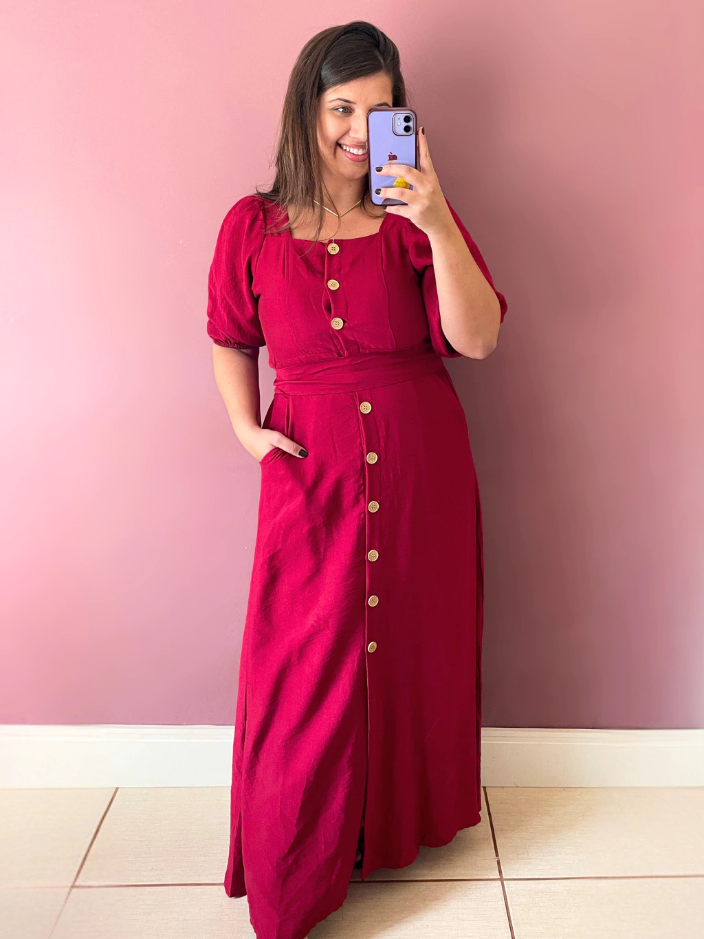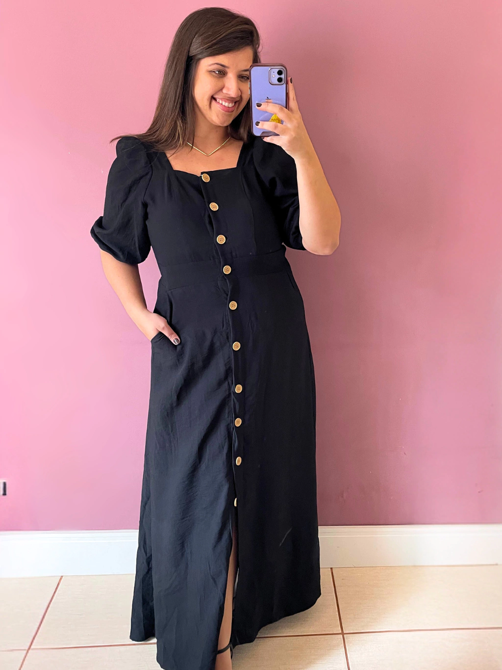 O decote quadrado valoriza o colo com sofisticação, e a manga princesa dá um charme atemporal. Possui bojo e todos os botões são funcionais, detalhe que deixa o visual ainda mais versátil.